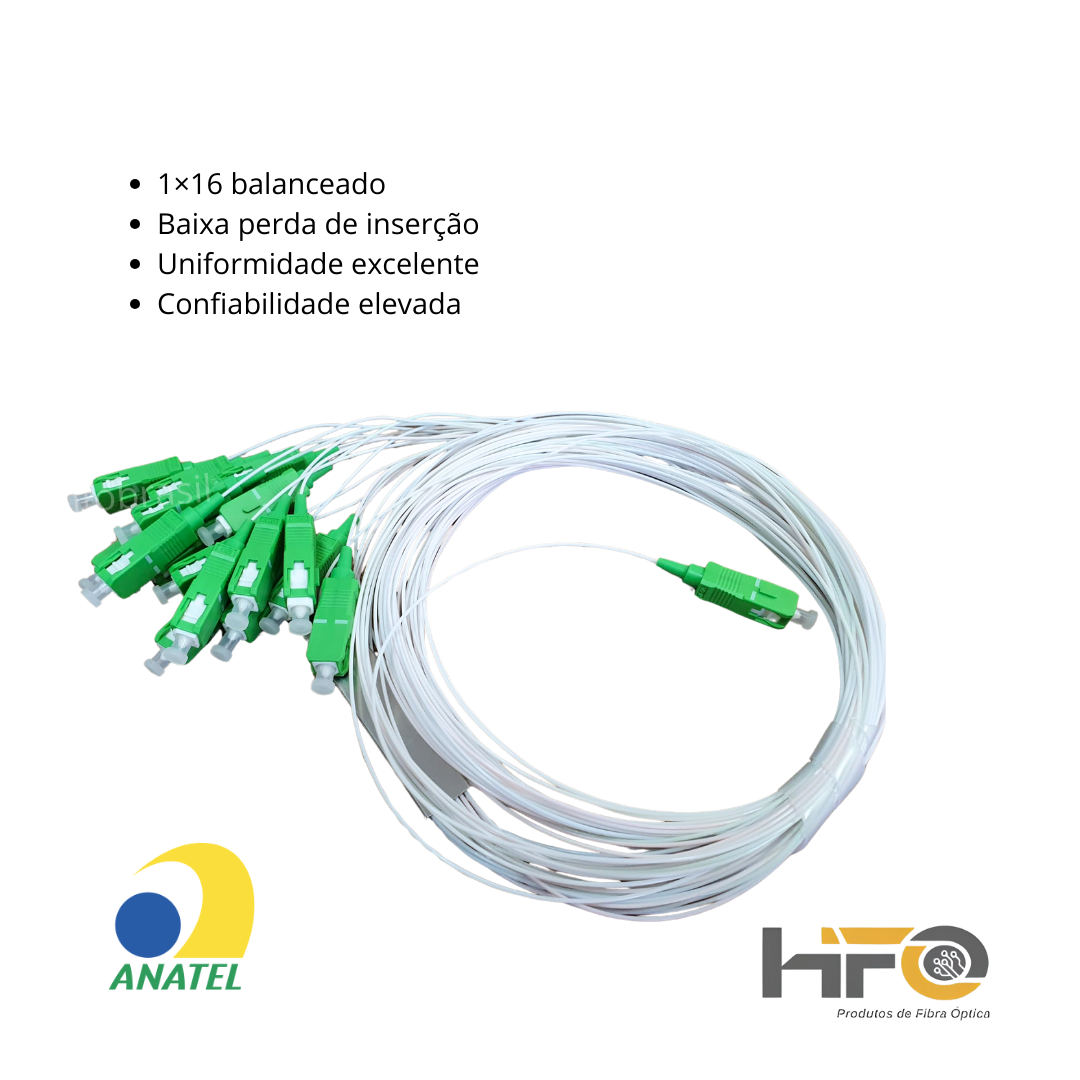 Splitter óptico 1×16 balanceado (PLC) e conectorizado no padrão SC de polimento APC para divisão do sinal óptico proveniente de uma fibra óptica para 16 e são desenvolvidos com tecnologia PLC (Planar Lightwave Circuit), feito para divisão da potência óptica, fabricado usando sílica para guia de onda óptica.